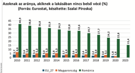– Ahogy a táblázatból leolvasható, egy évtized alatt negyedére, kerekítve 270 ezerről 73 ezerre csökkent az ilyen lakások száma. Összehasonlításként ott van a román érték, ami az unióban a legrosszabb. Ők is hatalmas fejlődésen mentek keresztül, de még van hova fejlődniük. Magyarországon 2010-ben még majdnem kétszer annyi lakásból hiányzott a vécé, mint az uniós átlag, mára viszont az átlag alá sikerült javulnunk.