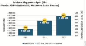 – Magának a lakásszámnak az alakulása az 1. számú táblázatban látható. Eszerint 2001-ben durván négymillió lakás volt Magyarországon, egy évtized múlva 325 ezerrel, újabb évtized elteltével már több mint félmillióval több. Mivel közben a lakosságszám csökkent, a száz lakosra jutó lakásszám ennél is nagyobb arányban nőtt, ma nagyjából két emberre jut egy lakás. Nem is a lakások száma kevés már, hanem az igazi kérdés a lakás felszereltsége és mérete, tehát a komfortfokozat és a zsúfoltság.