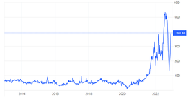 Aki olvassa a híreket, tudhatja, hogy Európa többi országában egészen más pályát járt be az áram ára az elmúlt két évben. Az 1. ábra például az olaszországi áralakulást mutatja. Mint a grafikonról leolvasható, idén augusztus elején a fogyasztók közel százszorosát (!) fizették a 2020. április végi árnak, de a 2021 előtti átlagár is csupán tizede volt az idei csúcson mért értéknek.