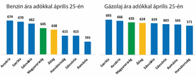 Ehhez képest április 19-én, amikor a KSH először publikálta a régiós üzemanyagpiac adatait, a 95-ös benzin átlagára 640, míg a régiós országokban 620 forint volt, azaz a magyarországi átlag 3,2 százalékkal magasabb volt a régiós értéknél. A dízelolaj magyar átlagára 654 forint volt, ez 31 forinttal, 5 százalékkal haladta meg a régiós 623 forintos átlagárat. A múlt héten frissültek az adatok, ekkor a benzin 4 százalékkal, azaz 25 forinttal került többe a régiós átlagnál, a dízel 27 forinttal, 4,3 százalékkal járt a régiós 622 forintos átlag fölött. A gyakorlatban ez azt jelenti, hogy hazánknál a régiós országok közül Ausztriában, Szerbiában és Szlovákiában mértek magasabb árszintet, míg Csehország, Horvátország, Lengyelország, Románia és Szlovénia esetében a 95-ös oktánszámú benzin átlagára kevesebb mint 10, Bulgáriában pedig több mint 10 százalékkal maradt el a magyarországitól.