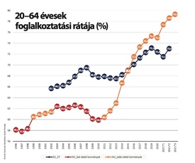 – Ugyanúgy megállította a zuhanást, mint 1998-ban. Majd megindult a növekedés, miközben az uniós átlag még sokáig stagnált. A magyar görbe 2012-től meredeken emelkedik, évente 50-100 ezer fővel, néha ennél is többel nőtt a foglalkoztatás.