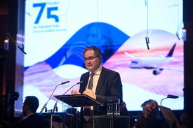 Nagy Márton nemzetgazdasági miniszter beszédet mond a Budapest Liszt Ferenc Nemzetközi Repülőtér 75. évfordulója alkalmából rendezett ünnepségen a budapesti Zeneakadémián 2025. május 21-én
