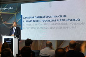 A nemzetgazdasági miniszter előadásában kiemelte: a fogyasztás növekedése kapcsán hat pillérre figyel a kormány, a stabil munkaerőpiacra, a dinamikus reálbérnövekedés fenntartására, az adócsökkentő politikára, a bővülő lakossági hitelezésre, az alacsony inflációra, valamint a háborúra és kereskedelmi konfliktusokra.
