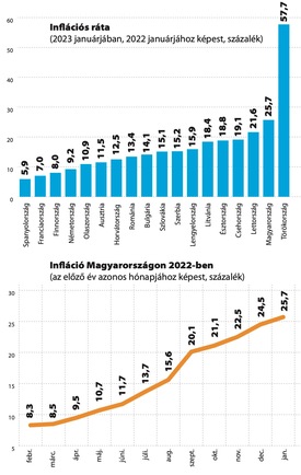 Az energia- és üzemanyag-árstopok kivezetése miatt januárban Magyarországon mérték a legmagasabb inflációt az Európai Unióban: 25,7 százalékot. A KSH szerint az energiáért 52,4 százalékkal, az üzemanyagokért 35,9 százalékkal kell többet fizetni, mint egy évvel korábban. Mivel ugyanakkor ezen termékcsoportok ára az idén már aligha nő, az év második felében markánsan visszafelé húzhatják az inflációs rátát. Veszélyt jelenthet viszont, hogy a magyarok hajlamosak az infláció öngerjesztővé tételére, amit a megugrott élelmiszerárak vagy a szolgáltatások januári drágulása kapcsán megtapasztalhattunk.