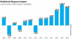 Egybehangzó vélemények szerint a magyar bérek gyors felzárkózása jövőre is folytatódik. Ezt segíti a tovább gyorsuló GDP-növekedés, ami a harmadik negyedévben már 5 százalékra emelkedett. De a kormány már eredetileg is 8,8 százalékos bérnövekedést valószínűsített a 2019-es költségvetésben. Az ING legfrissebb prognózisa szerint pedig 9 százalékkal nőhetnek a bérek jövőre – igaz, 3,4 százalékos infláció mellett.