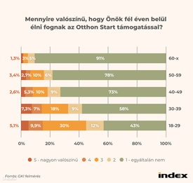 Ha csak azokkal számolunk, akik biztosra mondták, hogy belevágnak, akkor nagyjából 135 ezer háztartás csatlakozhat az Otthon Start Programhoz a következő fél évben. Ha pedig hozzávesszük azoknak a felét is, akik inkább csak valószínűnek tartják a részvételt, akkor a támogatottak száma már 205 ezerre nőhet. Ez óriási ugrás lenne a lakáspiacon: összehasonlításképp, tavaly egész évben összesen 127 ezer lakás cserélt gazdát. Vagyis az Otthon Start akár néhány hónap alatt több otthonteremtést indíthat el, mint amennyi egyébként egy teljes év alatt szokott megvalósulni.