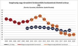 – Sikerült majdnem teljesen kivezetni a devizahiteleket, a családok behozták a rezsihátralékaikat. És történt még valami, megszületett a hatéves bérmegállapodás, a bérminimum megnőtt tizenöt százalékkal, a garantált bérminimum pedig huszonöttel. És ahogy a grafikonról leolvasható, a szegénységnek való kitettség csökkenése azóta is tart, a járvány sem rontott a mutatón érdemben.
