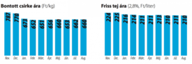 A korábban 27 százalékos áfakulcs alá tartozó bontott csirke ára például 770 forintról 673 forintra esett, majd 651 forintig csökkent, hogy aztán a 650-660 forintos sávban stabilizálódjon. A decemberig szintén 27 százalékon adózó tojás ára 389-ről előbb 367, majd 366 forintra mérséklődött. A 2,8 százalék zsírtartalmú nyers tej pedig, amely a 18 százalékos áfakörben volt, a korábbi 225 forintos szintről 216 forintra, majd a legfrissebb adatok szerint 210 forintra csökkent.