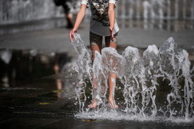 Járókelő a hőségben egy szökőkútnál a budapesti Szabadság téren 2025. június 5-én