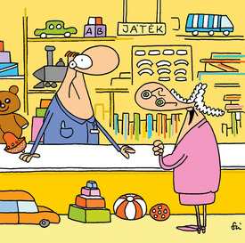 – A kis hároméves Kittike unokámnak szeretnék valami rózsaszín, műanyag, vállról indítható rakétát venni a szülinapjára!