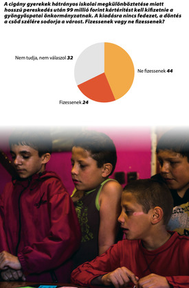 Eléggé egyértelmű a közvélemény válasza arra a kérdésre, hogy ki kell-e fizetni a bíróságok által legfelső fokon is megítélt 99 millió forintos kártérítést a gyöngyöspatai cigány családok részére. A megkérdezettek közül majdnem kétszer annyian mondták, hogy ne fizessen az önkormányzat és az iskola, mint ahány szerint fizetnie kellene. A semlegesek aránya 32 százalék volt.