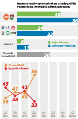 Jelentős fordulat állt be a két nagy politikai tábor versenyfutásában, ami, ha most vasárnap lennének a választások, biztos kétharmados fölhatalmazást eredményezne a kormányoldalnak. Úgy tetszik, a járványra adott reakciókat a kormánynál helyeselte, az ellenzéknél nagymértékben elutasította a közvélemény. Bár az adatokból nem tűnik ki, a budapesti válaszok alapján nagy valószínűséggel a fővárosban is átvették a vezetést a kormánypártok. A közömbösök aránya 30 százalék volt.