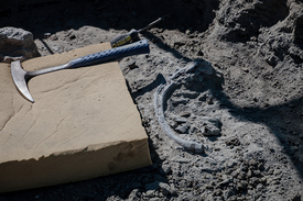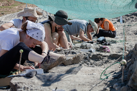 – Minden nyáron egy húsz-huszonöt főből, zömében egyetemistákból álló csapattal dolgozunk a lelőhelyen, amikor is átlagosan 800-900 csontmaradvány kerül elő. Az, hogy a kutatásokat immár tizenhat éve folytatni tudjuk, köszönhető elsősorban a Nemzeti Kutatási, Fejlesztési és Innovációs Hivatal támogatásának, a Magyar Tudományos Akadémia Lendület programjának, az ELTE-nek, a Magyar Természettudományi Múzeumnak, illetve a Céltrans 97 Zrt.-nek, akik minden szezonra egy terepjárót kölcsönöznek nekünk, ami hihetetlen előrelépés a több mint tíz évig használt Trabant után – mondja a csapat vezetője, aki az idei legfontosabb leletet firtató kérdésünkre egyből a megtalált csontokhoz vezet bennünket. – Legérdekesebb leletünk egy Hungarosaurus tormai, azaz páncélos dinoszaurusz csigolyája és a hozzá kapcsolódó két nagy háti borda, melyek, ebben az egyébként nagyon durva kőzetben is, összeforrva csatlakoznak egymáshoz. Ez azt jelenti, hogy nagyon keveset – vagy egyáltalán nem – szállítódtak, vagyis ezek a négy-négy és fél méter hosszú, négylábú növényevő dinók, ha nem is pont ezen a helyen, de ehhez közel, egy-két kilométeres körzetben élhettek, feltehetően csordákban.