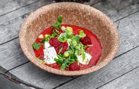 Üdvözlőfalatként kiváló, ropogós héjú, belül puha barna zsemlét kaptunk jó ízű, zöld fűszeres túrókrémmel. Ittunk indításnak a Sauska pincészettől két pezsgőt, majd az ételekhez két furmintot, egy reduktívat és egy fahordós, dűlőszelektált tételt.