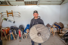 Garázsában nyergek sorakoznak a fal mellett, és igazi filmes ereklyékre is bukkanunk: szász és viking pajzsok a The Last Kingdomból, és egy jókora filmes arzenál – kardok, fejszék –, amellyel egy kisebb portyának is szerét lehetne ejteni, de embert ölni csak nagyon elszántan, hisz műanyagból vannak. Katrics Tamás egyszer csak előveszi a híres, borostyánkőben végződő kardot, Uthred, azaz Alexander Dreymon sorozatbeli kardját, amely a dánként felnevelt IX. századi szász harcos sorsának a szimbóluma. A színésztől kapta ajándékba, ami nagy dolog, mert mindenki pályázott rá. Még mielőtt megkérdeznénk, már mondja is, hogy természetesen megfoghatjuk, suhinthatunk is vele – nem sokat habozunk, jóval könnyebb, mint hittük. Pár hete jelent meg meg a Seven kings must die című film, amely elvarrja az idézett sorozat szálait, Katrics Tamás ebben is a főszereplő, Alexander Dreymon dublőreként játszott, és szerinte a német színész egy igazi „nice guy”.