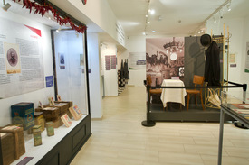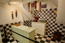 A monarchia mindennapjait idézi meg a kiállítás egyik leglátványosabb enteriőrje, ami egy korabeli hentesüzletet mutat be: a fekete-fehér csempés boltocska sarkában álló hústőkébe tekintélyes méretű bárdot ütöttek, a padlón vérfoltok – ne ijedjünk meg, csak illusztráció –, a pulton pedig a múlt század elejéről származó húsbárdok, húsvágó és -daraboló kések sorakoznak. A falon hurkatöltők, az asztalon egy korabeli Berkel mérleg díszeleg, míg az öntöttvas, kézzel hajtható húsdaráló sokunknak lehet ismerős: számos mai háztartásban is – az idősebb generáció körében biztosan – megtalálható, és nagy eséllyel működik is.