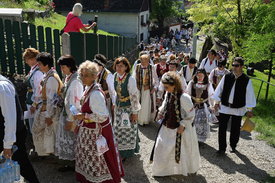 Barcasági csángó-magyar népviseletbe öltözött résztvevők a Brassó megyei Tatrangból induló II. Barcasági és királyföldi csángó-magyarok zarándoklatán Pürkerecen 2023. július 1-én