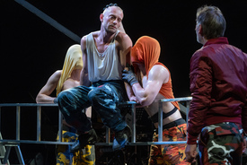 Benedek Mária jelmezei külön említést érdemelnek: a katonai terepmintás ruhákat idéző, rikító színekben pompázó kreációk egyfelől jelzik, hogy a darab alapvetően militáns közegben játszódik, másfelől érzékeltetik, hogy e közegben milyen intenzív negatív ingerek érik az embert.