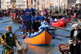 A velencei karnevál vízi parádéja a Canale Grandén 2025. február 16-án.
