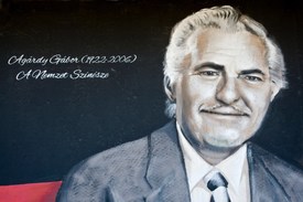Agárdy Gáborról, a Nemzet Színészéről, a Nemzeti Színház örökös tagjáról készült köztéri falfestmény a Rákóczi híd pesti hídfőjénél. A portré a Suppré-Neopaint faldekorációs csoport alkotása. MTVA/Bizományosi: Faludi Imre