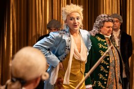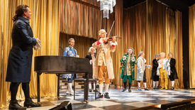 Ami pedig Mozartot illeti: Hegedűs D. Géza rendezésében a címszereplő a felnövést elmulasztó, infantilis és irritáló figurává vált, aki nemhogy nem akar, de talán nem is tud elfogadhatóan viselkedni, így a környezetében lévők többsége okkal tartja kiállhatatlannak. A címszerepet alakító ifj. Vidnyánszky Attila pedig ijesztő hatékonysággal formálja meg ezt a karaktert. Olyan jó munkát végez, hogy a néző nem igazán tudja megkedvelni ezt a Mozartot, aki zsenijének tudatában van, ennek nemegyszer hangot is ad, ám ezen kívül nem sok minden számít neki: furcsán beszél, gyakran rosszul időzítve, magát szerencsétlenül kifejezve; szemlátomást nem törődik azzal, éppen milyen ruhát visel; szexuálisan túlfűtött, felesége és gyermekei eltartására ugyanakkor képtelen. Vagyis: nyilvánvalóvá válik, hogy ebben a Mozartban semmi, de semmi isteni nincs, csak a zenéje.