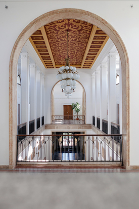 Mielőtt azonban belesnénk a stúdiókba, érdemes egy kicsit elidőzni a tágas előcsarnokban, az oldalfalakon szemügyre venni az Ispánki József, Madarassy Walter és Borsos Miklós fémjelezte terrakotta domborműveket, a mennyezet vörös-sárga allegorikus figuráit, szőlőfürtszerű, hatalmas csillárjait, no és a lépcsőház kétszintes kerengőjét, ahol jelenleg Jankovics Marcell Ének a csodaszarvasról, illetve Az ember tragédiája standfotóiból nyílt kiállítása vár minden érdeklődőt, ingyenesen, előzetes bejelentkezés nélkül.