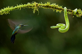 – Jó néhány éve ugyanaz a három a kedvencem. Az egyik a leveleket szállító hangyákat megörökítő Árnyjáték című éjszakai felvételem, amellyel elnyertem Az év természetfotósa díjat, és a kép elkészülte után jöttem csak rá, hogy sokkal tartalmasabb ez a kocka, mint amennyit először láttam benne, hiszen egy komplett történetet mesél el. A második az a fotóm, amin egy faágon csüngő kígyót egy kolibri próbál elriasztani, a harmadikon pedig pelikánok láthatók. Utóbbit az teszi egyedivé, hogy a felvétel felét különleges perspektívából, szinte ernyőként leereszkedve egy csőrlebeny tölt ki, míg a képmező többi részén vagy tíz másik madár helyezkedik el. Körülbelül még két tucat egyéb munkámra vagyok büszke, de egyik sem ér fel az említettek szintjére.