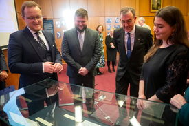 Vincze Máté, a Kulturális és Innovációs Minisztérium közgyűjteményekért és kulturális fejlesztésekért felelős helyettes államtitkára (b2), Rózsa Dávid, a Magyar Nemzeti Múzeum Közgyűjteményi Központ Országos Széchényi Könyvtár (MNMKK OSZK) főigazgatója (b), Ian Biggs, Ausztrália rendkívüli és meghatalmazott nagykövete (j2) és Laskai Anna zenetörténész, az Országos Széchényi Könyvtár Színháztörténeti és Zeneműtár csoportvezetője megtekinti az Ausztrál Nemzeti Könyvtárból érkezett magyar népzenei és kórusműveket tartalmazó hungarikagyűjteményt a bemutató napján a Magyar Nemzeti Múzeum Közgyűjteményi Központ Országos Széchényi Könyvtárban (MNMKK OSZK) 2025. január 28-án