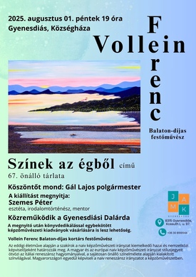 A Balaton ugyanis nem csupán egy táj, hanem érzés és életforma is. Beleszeretős. Különösen annak, aki ide született, együtt él vele. És mivel inspirál, hamarabb és könnyebben nyúlunk a kameránkhoz, ragadunk tollat, fogunk ecsetet, hogy megörökítsük a soha vissza nem térő pillanatot. A színek, a fények, a hullámok játékát. Amely nemcsak minden évszakban, de minden nap, minden percben más és más. Ezerarcú. Ezt az ezerarcúságot szeretné Vollein Ferenc is visszaadni vásznain. A most Badacsonyörsön élő festő 1999-ben született Balatonfüreden, ahol már az óvodában megmutatkozott a rajz, a rajzolás iránt érzett szeretete, tehetsége, amelynek kibontakozását néhány évvel később Zalaegerszegen olyan kiváló magántanárok, mint Németh Miklós grafikusművész vagy Karner László festőművész, művészetpedagógus segítették. 2019-ben a „kis képző”-nek is nevezett Várpalotai Képesség- és Tehetségfejlesztő Magániskola Gimnáziumának képzőművészeti tagozatán érettségizett, vizsgadolgozatát a Badacsonytomajon élt Kossuth-és Munkácsy-díjas festőművész, Udvardi Erzsébet képzőművészeti hagyatékának a sorsáról, utóéletéről írta. Festészetére ugyanakkor a legnagyobb hatással itáliai tanulmányútjai voltak, melyek során különösen a velencei és a firenzei reneszánsz festőiskola, a naiv kortárs neoreneszánsz olasz festészet nyűgözte le. És, bár az olasz városok, a mediterrán életérzés és színvilág vásznain rendre visszatérnek, mégsem ezek a legfontosabbak számára: