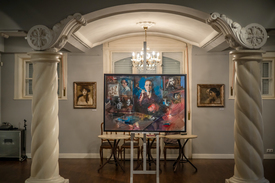Gyémánt László 1964-ben az Ernst Múzeumban állította ki először Cosmopolis című festményét, amely ma a Magyar Nemzeti Galéria tulajdona. A képen, mely egy olaszországi utazása hatására született, a Colosseumot láthatjuk, falába építve mindazt, amit a művész ott, a nyugati világban látott és tapasztalt, és amitől itthon hermetikusan el volt zárva. Az Art Salon Társalgó Galéria központi festménye most egy ehhez hasonló összegzés. Csak éppen sokkal személyesebb, hiszen Gyémánt László ráfestette élete legfontosabb szereplőit. A triptichon középpontjában természetesen Edinát láthatjuk.