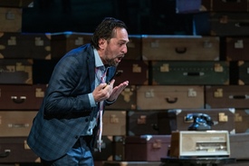 A székesfehérvári előadás Horesnyi Balázs tervezte díszlete konkrét és szimbolikus elemekből áll: az előteret a Loman-házban játszódó jelenetben egy jókora – a konyhában álló, családi – asztal, valamint a köréje tett székek uralják. Mögöttük viszont kofferek és utazótáskák fala magasodik, a lakás többi helyiségének és számos egyéb bútordarabjának funkcióját átvéve.