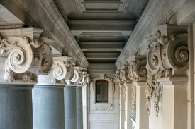 Bár kívülről mindkettő valóban ugyanolyan díszes megjelenésű, a főőrség belső terei jóval puritánabbak és letisztultabbak, mint ahogy a külső alapján gondolnánk. Nem véletlenül. Az egykori kaszárnya belsejét eredetileg sem cicomázták túl, így a falakat ma is mindenféle díszítőelem nélkül, egyszerűen csak vakító fehéren hagyták. A központi hatalmas tér étteremként nyílik meg jövő tavasszal, az emeleten rendezvénytermet, az alsó szinten pedig konyhát és biztonságtechnikai részt rendeztek be.