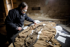 – Ásatási körülmények között előkerülő miseruháról nem igazán tud a szakma, így ez a lelet igazán unikális – mondja Papp Ildikó. Akkurátusan leemeli a miseruhát védő anyagréteget, és feltárul az igen szakadozott, elrongyolódott öltözet, aminek még így, megviselt állapotában is jól kivehetőek gazdag hímzései, szabása, sőt díszítményei is. Az öltözet hátára keresztet hímeztek, az egymás alá varrt figurális ábrázolások püspökszenteket mutatnak, az egyik díszítménysor alján még Szent Péter kulcsa is jól kivehető. Az egykor vörös, gránátalmamintás anyag még most is csillog az aranyszálas hímzéstől: a dús aranyszövésnek volt köszönhető, hogy a sír mélyén konzerválódott, olyannyira, hogy még a selyembélése is megmaradt.