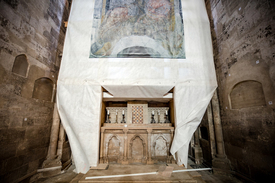 Egy másik régészeti szenzáció az egyik főhajóban feltárt sírból került elő: több mint ötszáz éves, díszes miseruha, vagyis casula, amire érdekes módon nem a szentélyben, hanem a világiak által használt temetkezési területen bukkantak.
