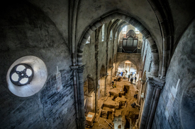 Később felkapaszkodunk a templombelső felújításához ácsolt, a szentélyben álló, négy emelet magas faállványzatra: a különböző szinteken közelről láthatók a középkori falfestések, van, amit sablonnal, van, amit szabad kézzel készítettek. Egy különleges betűkből álló szövegrészlet is kivehető az öreg kőfalra festve, amelynek jelentését eddig még nem fejtették meg a szakemberek. És persze közelről láthatjuk a főszentély keleti falát borító falképet, a templom egyik legrégebbi freskóját, a XIII. század derekáról származó Sárkányölő Szent György-ábrázolást: a középkori templomépítők az épület keleti oldalát, azaz a szentélyt építették meg legelőször, az oltárképet pedig mihamarabb megfestették. Kérdés, miért éppen a katonaszent tiszteletére emelték a templomot, aki inkább illik egy harcos nemesi családhoz, mint a bencés barátok szelíd közösségéhez.