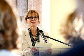 Lévai Anikó, Orbán Viktor miniszterelnök felesége beszédet mond a Kós András 110 című életmű-kiállítás megnyitóján a Pesti Vigadóban 2025. április 29-én