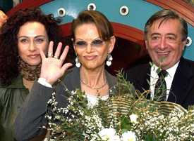 Claudia Cardinale olasz színésznő rajongóinak integet Bécsben 2002. február 6-án. Cardinale a Bécsi Operaház vendégeként tartózkodik az osztrák fővárosban. Jobbról Richard LUGNER építési vállalkozó, balról neje, Christine