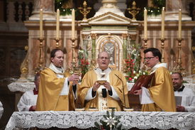 A bíboros a zsúfolásig telt székesegyházban a szentmise kezdetén emlékeztetett: karácsonykor azt ünnepeljük, hogy Isten úgy szerette a világot, hogy egyszülött fiát adta érte.