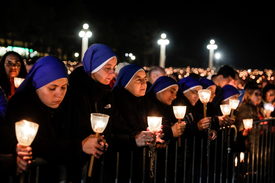 Apácák a Szûz Mária megjelenése tiszteletére tartott gyertyás körmeneten a fátimai Mária-kegyhelyen 2023. május 12-én.