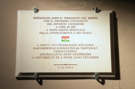 A templomba tábla került a magyar és az olasz zászlóval, amely emlékeztet arra, hogy a magyar kormány finanszírozta a helyreállítást.