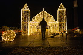 Látogató a pécsi Zsolnay Kulturális Negyed fényparkjában 2025. október 24-én.