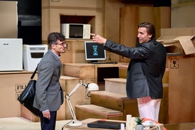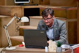 A Jászai Mari Színház kamaraszínházában látható, Guelmino Sándor rendezte előadás díszletének meghatározó darabjai kartonból épített elemek, sugallva: mindaz, amivel a munkahelyén szembesül az ember, sokban hasonlít a papírhoz: könnyen eldobható vagy cserélhető, tehát nem túlságosan értékes. A következő megoldás, amely elgondolkodtathatja a befogadót: a cselekmény egyik pontján kifröccsenő testnedveket a szünetben nem takarítják fel, így az előadás végéig látható maradnak. A karakterek a tócsákba nyúlnak és lépnek, a teljes színpadon széthordva a matériát, tudatosítva: a múltban történtektől nem lehet végképp megszabadulni, így az ember magán viseli a nyomait, akármerre megy.