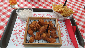 Kínálnak lencselevest füstölt harcsával, halburgert, sült keszeget, pisztrángot, süllőt, harcsát. Mi egy kis adag halászlevet kértünk (1290 Ft), és haltepertőt (590 Ft/10 dkg), hozzá sült krumplit és kulimász nevű majonézes salátát. Mindemellé sört és Meccset ittunk, utóbbi meggyborból készült palackozott fröccsöt jelent, ezt eddig még nem próbáltuk. Kifejezetten jó volt, akárcsak az ételeink. A soproni Keszegsütőt jó szívvel ajánljuk másoknak is.