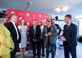 Hankó Balázs kulturális és innovációs miniszter (j) a budapesti József Attila Színházban tartott sajtótájékoztatón 2025. április 4-én. A következõ öt évben a kulturális kormányzat a közös mûködtetésû színházak támogatására évente minimum 25 milliárd forintot biztosít. Mellette Bán Teodóra a Margitszigeti Szabadtéri Színház ügyvezetõ igazgatója, Oberfrank Pál, a Veszprémi Petõfi Színház igazgatója, Novák Irén, a Kulturális és Innovációs minisztérium mûvészetért és közösségi mûvelõdésért felelõs helyettes államtitkára, Kirják Róbert, a nyíregyházi Móricz Zsigmond Színház igazgatója, a Vidéki Színházigazgatók Egyesületének elnöke, Besenczi Árpád, a zalaegerszegi Hevesi Sándor Színház igazgatója, Dörner György, az Újszínház igazgatója (b-j).