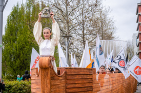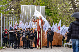 – A nyitónapra mi, Karzat Színház-asok készítettük el azt a hatalmas, több mint huszonöt méteres bárkát, aminek közös mozgatásába felkérésünkre bekapcsolódtak más utcaszínházas szereplők, többek között a Langaléta Garabonciások és a Bab társulat is. Így érkezett meg a bárka, benne az olimpia megvalósításában részt vevő kőszínházak képviselőivel és a Színházi Olimpia jelképével, a Görögországból hazánkba érkező maszkkal a Nemzeti Színház elé. A professzionális színházak szereplői, ha jelképesen is, de vállalták velünk a közösséget – mondja Pál Kálmán.