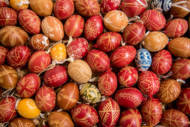 Az ünnepi kellékek közül a legismertebb a tojás. A leletek, amelyek ásatásokon kerültek elő, azt bizonyítják, hogy az első húsvéti tojások pirosak voltak, a vérre emlékeztettek. Ez a szín később Jézus kiontott vérét is idézte. Más, keletről jött népek is használták jelképként a tojást. A Belső-Ázsiából a Kárpát-medencébe költözött avarok sírjából kerültek elő piros színű tojáshéjak, amelyek a továbbélést fejezték ki. Nevezetes a kiszombori hun–avar temető egyik sírjában talált héj: a tojásból maradt, amit a halott kezébe tettek, reménykedve a feltámadásban. Ez azt is jelenti, hogy a piros tojást őseink már egészen korán Európába hozták. Nem csak egyszínűre festették, a díszítésüket is művészi fokra fejlesztették. Olyan motívumokat használtak, amelyek egyébként is gyakoriak voltak a népcsoportnál.
