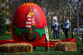 Óriástojás a hajdúszoboszlói húsvéti parkban 2022. április 12-én. A parkot képzőművészek, valamint művészeti iskolák oktatói és diákjai díszítették fel a közelgő ünnepre