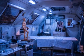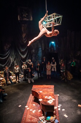 Sötét labirintuson vágunk át, az egyik kanyarban agancsos lény figyeli lépéseinket, a következő fordulóban lelógó drapéria árnyékában üres szék árválkodik, a földön penna és szétdobált levélpapírok – talán egy pillanattal korábban itt körmölt valaki üzenetet titokzatos megbízatásáról kedvesének. Aztán egy tágas terembe érünk, oldalt vaslépcső fut fel a semmibe, középen hatalmas zongora terpeszkedik. A fal mellett derékmagasságig felhalmozott könyvek állnak, a másik oldalon jókora irányítópult, mintha Verne fantasztikus tengeralattjárójának kivénhedt tartozéka volna. A sarokban ókori harci sisak, egy félreeső asztalkán pedig antik torzó sejteti, Hektór, a trójai herceg birodalmában vagyunk. A herceg előlép, és a zongora fölé ereszkedő rácsos szerkezetre kapaszkodva kezdetét veszi az erőt és szépséget egyszerre sugárzó levegőszáma: tépelődve, küszködve végső harcára készül.