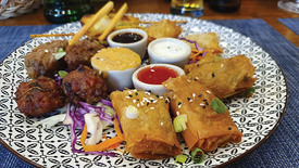 Kértünk egy garnélás Tom Yum levest, egy Távol-Kelet fantázianevű vegyes tálat (rajta: lime-os, csípős paprikás thai fasírt, thai citromfű nyárson sült húsgombóc, satay, szamósza és tavaszi tekercs négyféle mártással kísérve) pisztáciás sertésszüzet szilvával és krumplipürével, valamint matcha teás piskótatekercset. Ételeink ízletesek voltak, izgalmasak, vibrálóak. Érdekesség, hogy bort nem lehet rendelni, azt ingyen töltik kóstoltatás után. Az árak amúgy is nagyon barátságosak, a négy fogásra egy sörrel együtt 7000 forintnak megfelelő lejt fizettünk.