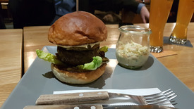 Kóstoltunk egy heti burgert, melyben a szaftos, tökéletesen hőkezelt marhahúspogácsát egy préselt, megdermesztett, majd megpirított malacfejhúspogácsa egészített ki több más izgalmas belevalóval együtt, kértünk egy sima sajtburgert extra jalapeñóval, mert az alapjáratot is ismerni kell, a böjtöt tartó barátunk pedig vega burgert rendelt. Kísérőnek hárman ettünk egy adag helyben készült csipszet házi ketchuppal és házi majonézzel. Burgereink kifogástalanok, sőt katartikusak voltak, jól passzolt melléjük a ropogós csipsz. Zubr és Schöfferhofer sört csapolnak, mellette tartanak százszázalékos szabolcsi almalevet és remek limonádékat is.